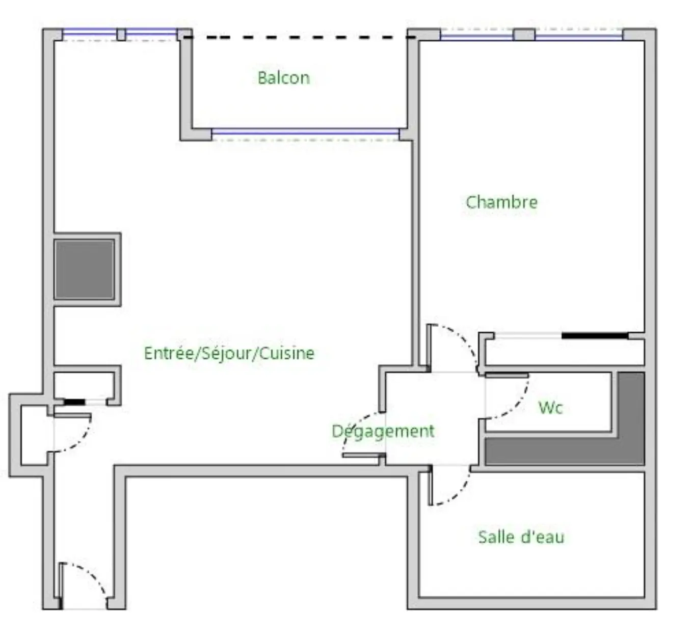 L’entrée dessert un séjour avec cuisine ouverte, prolongée par un balcon accessible aussi bien depuis le séjour que depuis la chambre. La chambre dispose d’un dressing intégré. Un dégagement distribue également une salle d’eau contemporaine ainsi qu’un WC indépendant.