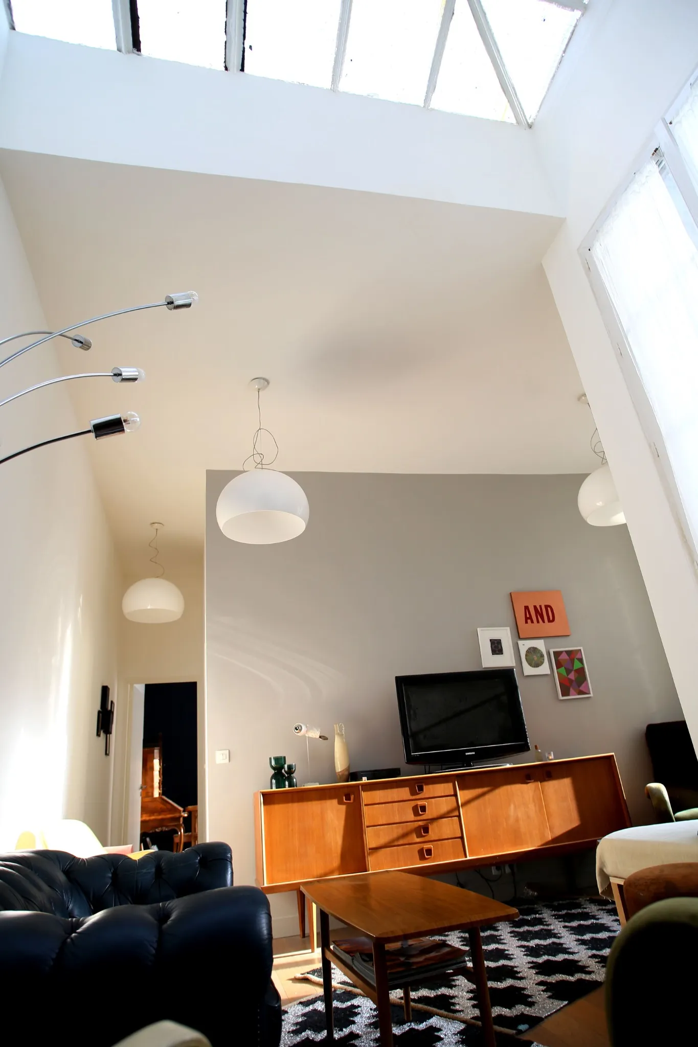 Le séjour, pièce maîtresse du lieu, se distingue par sa hauteur sous plafond de plus de 3,50 m et sa superbe verrière zénithale, qui diffuse une lumière naturelle généreuse tout au long de la journée. Exposé plein Sud, il bénéficie d’un ensoleillement constant et d’une atmosphère à la fois chaleureuse et paisible.