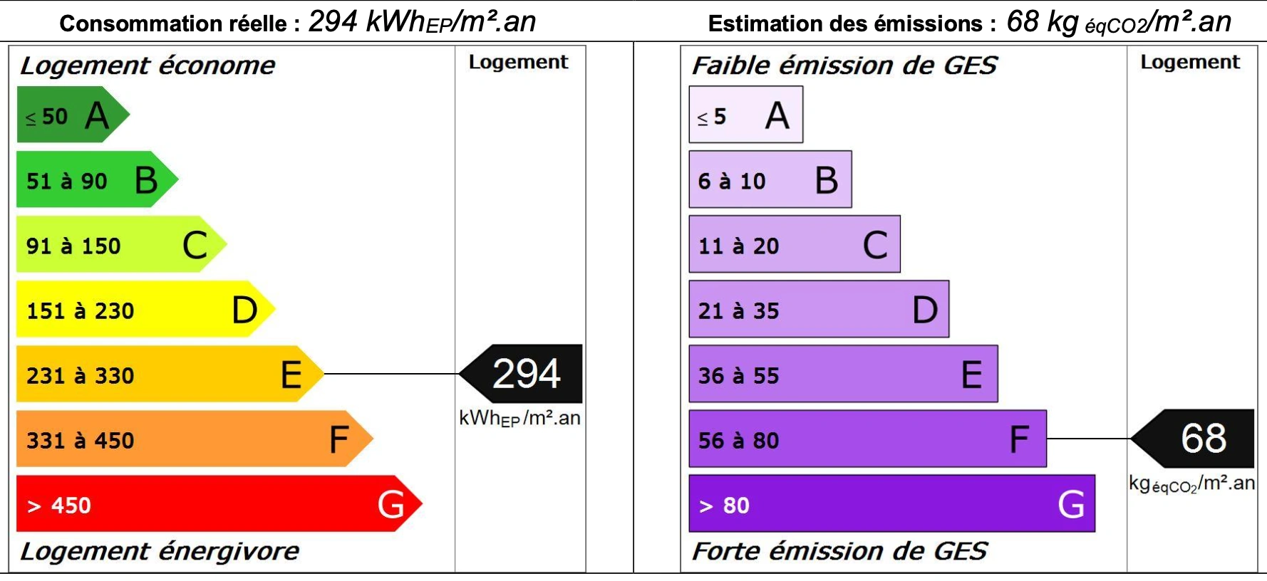 Diagnostic de performance énergétique d’un appartement situé rue du Faubourg Saint-Denis à Paris 10, classé E pour la consommation énergétique et F pour les émissions de gaz à effet de serre.