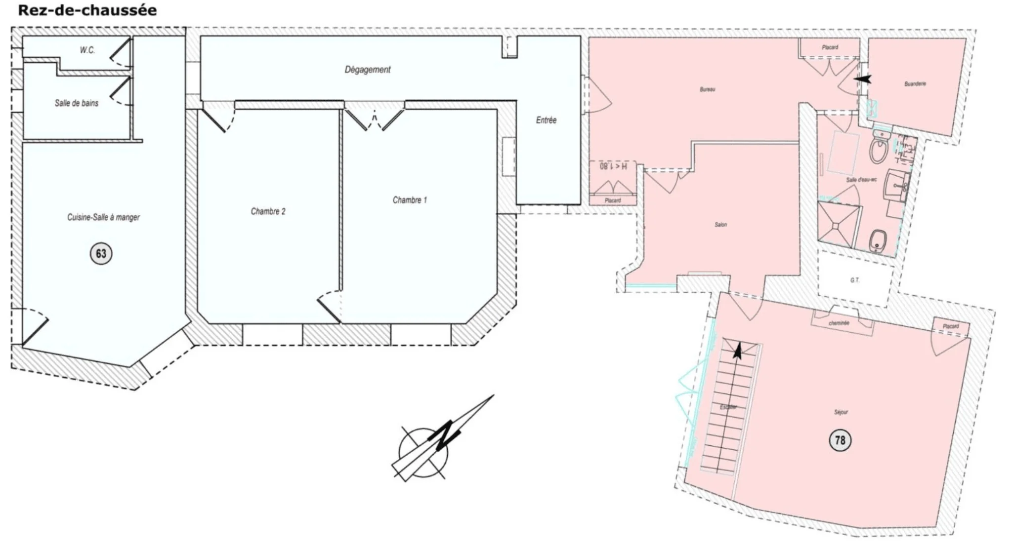 Le rez-de-chaussée réunit une entrée, deux salons aux volumes généreux (HSP 3,16 m), un bureau, une cuisine salle à manger, deux chambres, une salle d’eau avec WC, une salle de bains, une buanderie, ainsi qu’un WC indépendant.