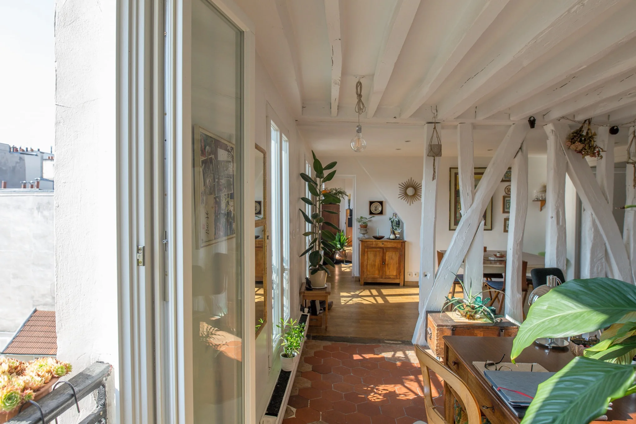 Niché aux 5ᵉ et 6ᵉ étages d’un immeuble ancien sans ascenseur, l’appartement dévoile une atmosphère chaleureuse où le charme des matériaux d’origine – poutres apparentes, tomettes anciennes, touches boisées – s’harmonise subtilement avec les aménagements contemporains réalisés.