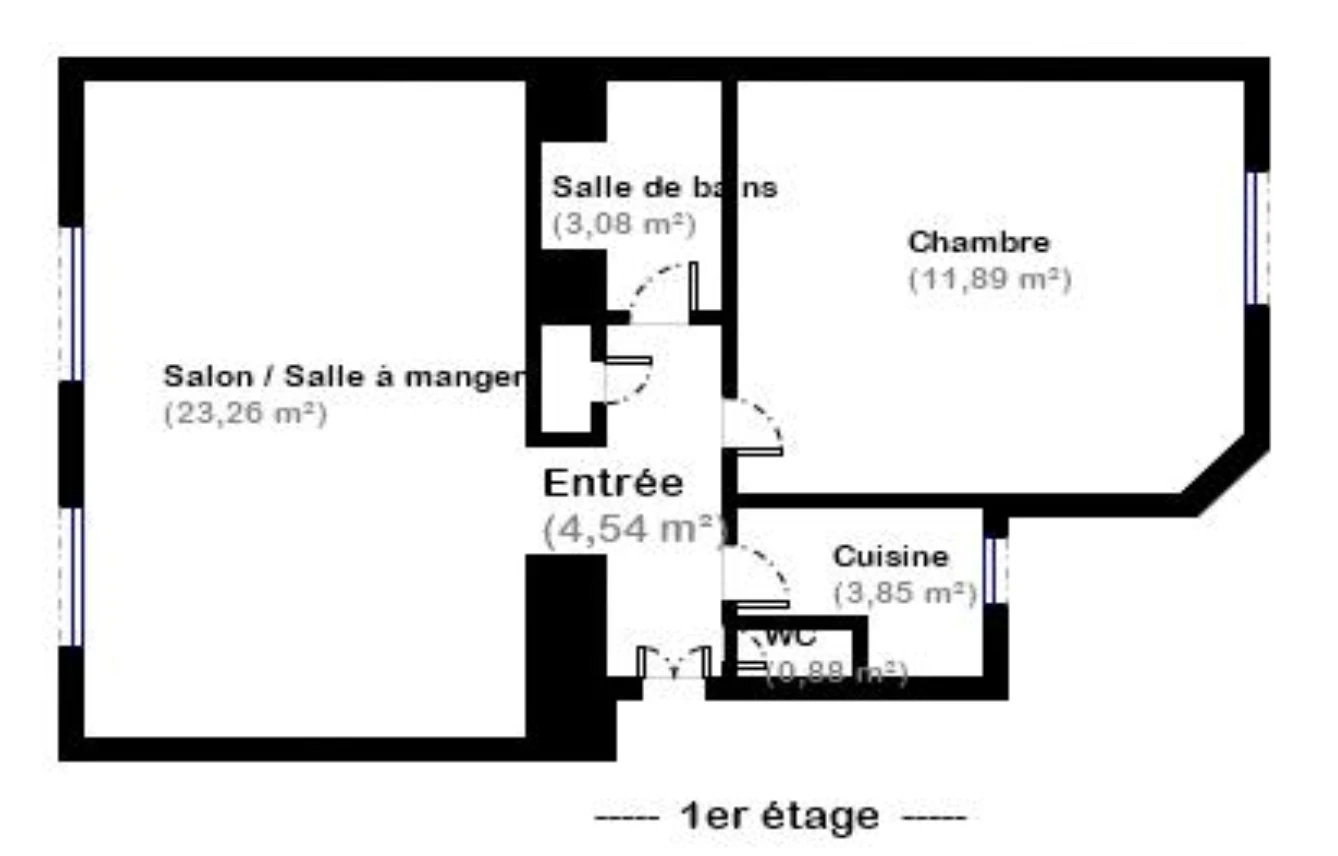 | 1 | Salon / Salle à manger | 23.26 | Sud/Ouest | Rue |