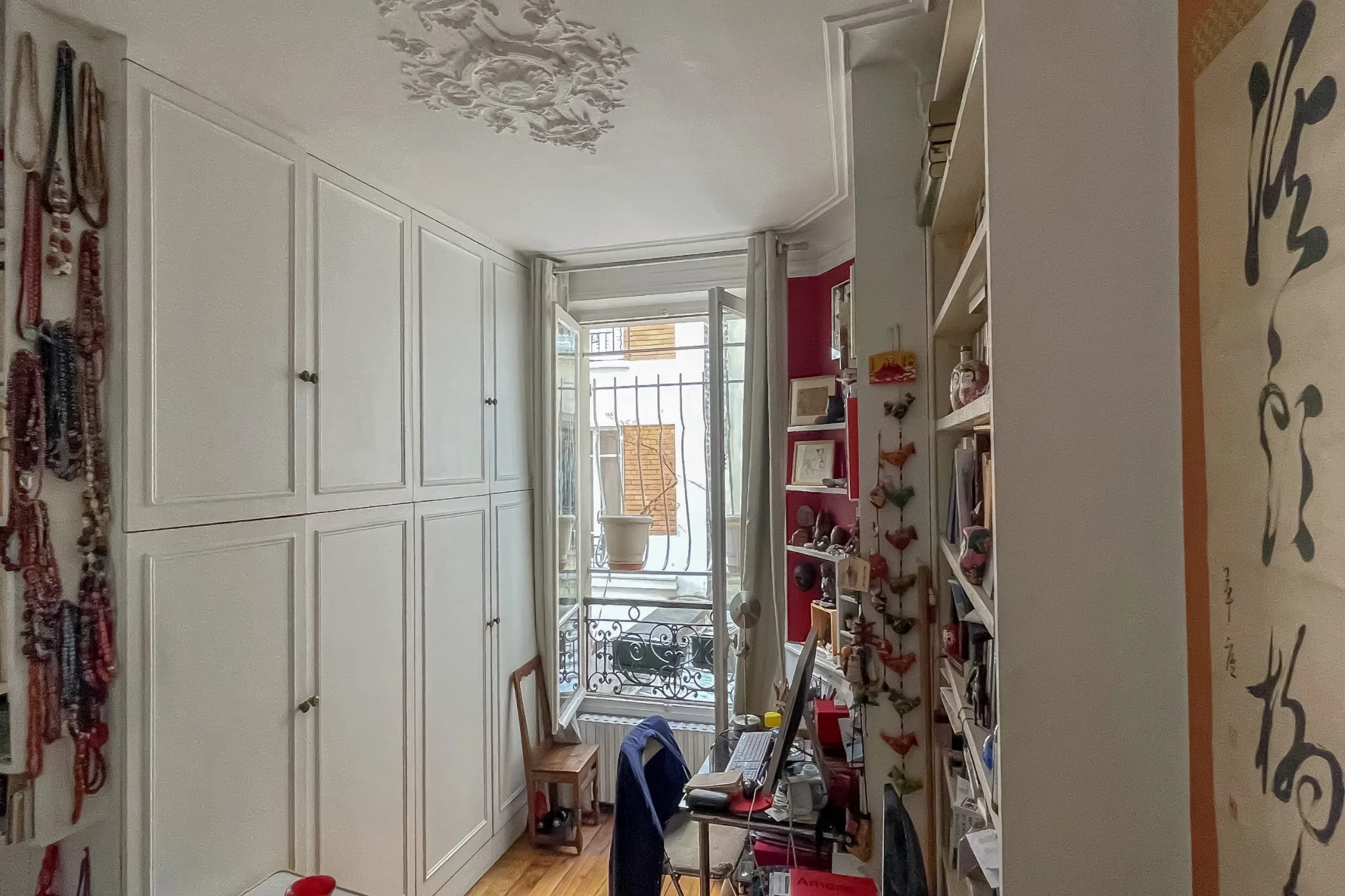 La chambre, orientée Nord-Est sur cour, offre un véritable sentiment de quiétude, rare dans un appartement à vendre à Paris 17.