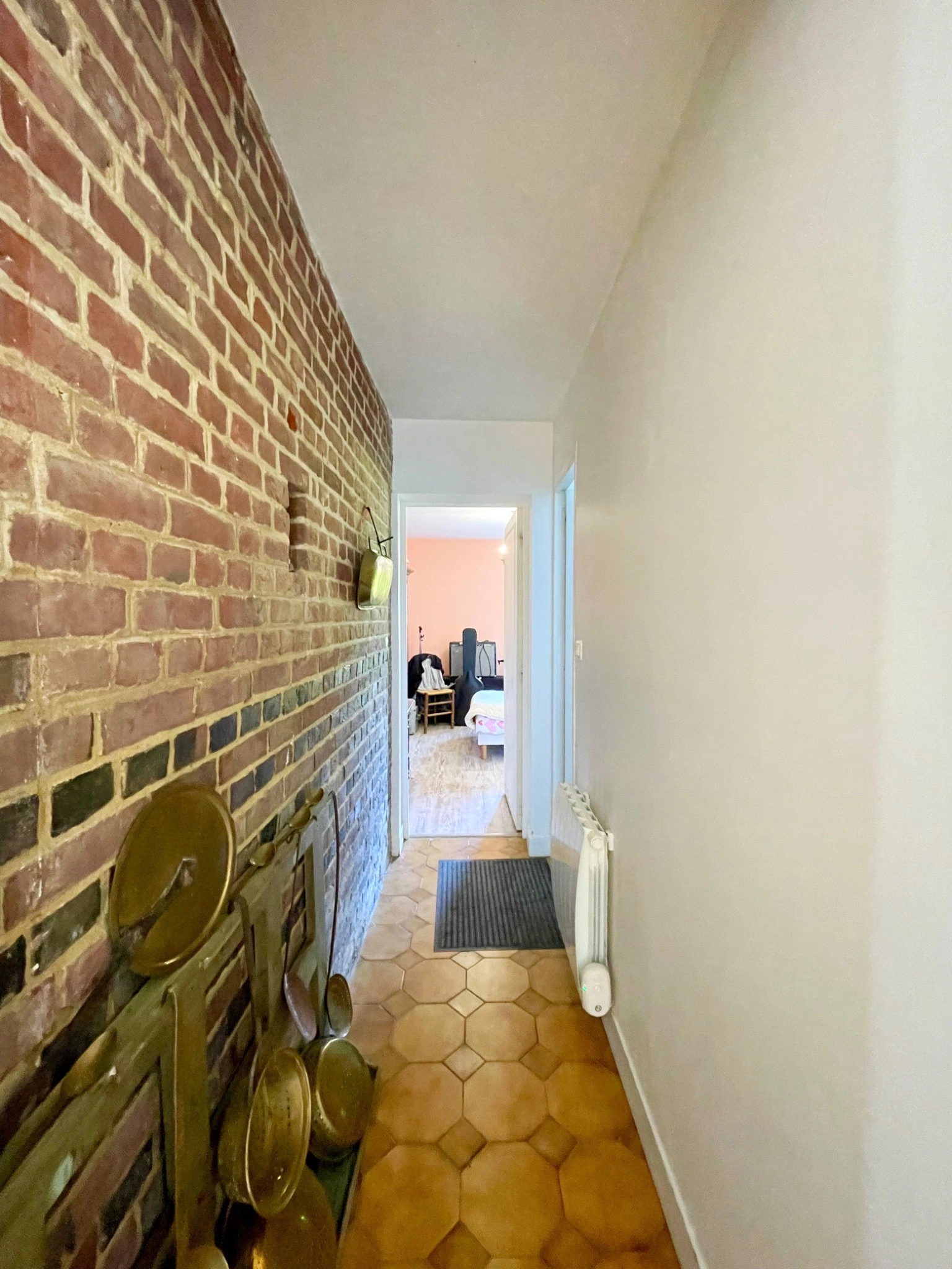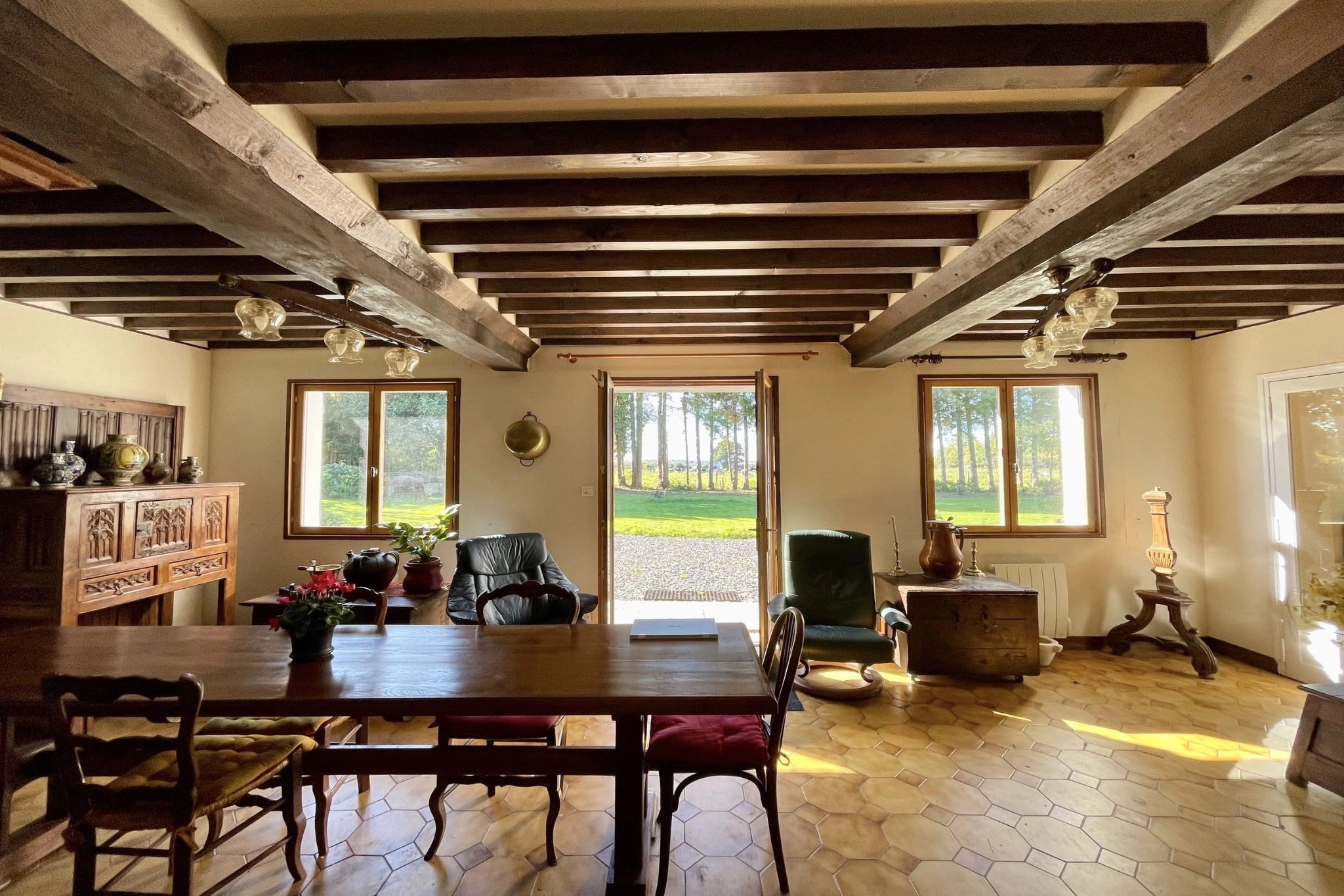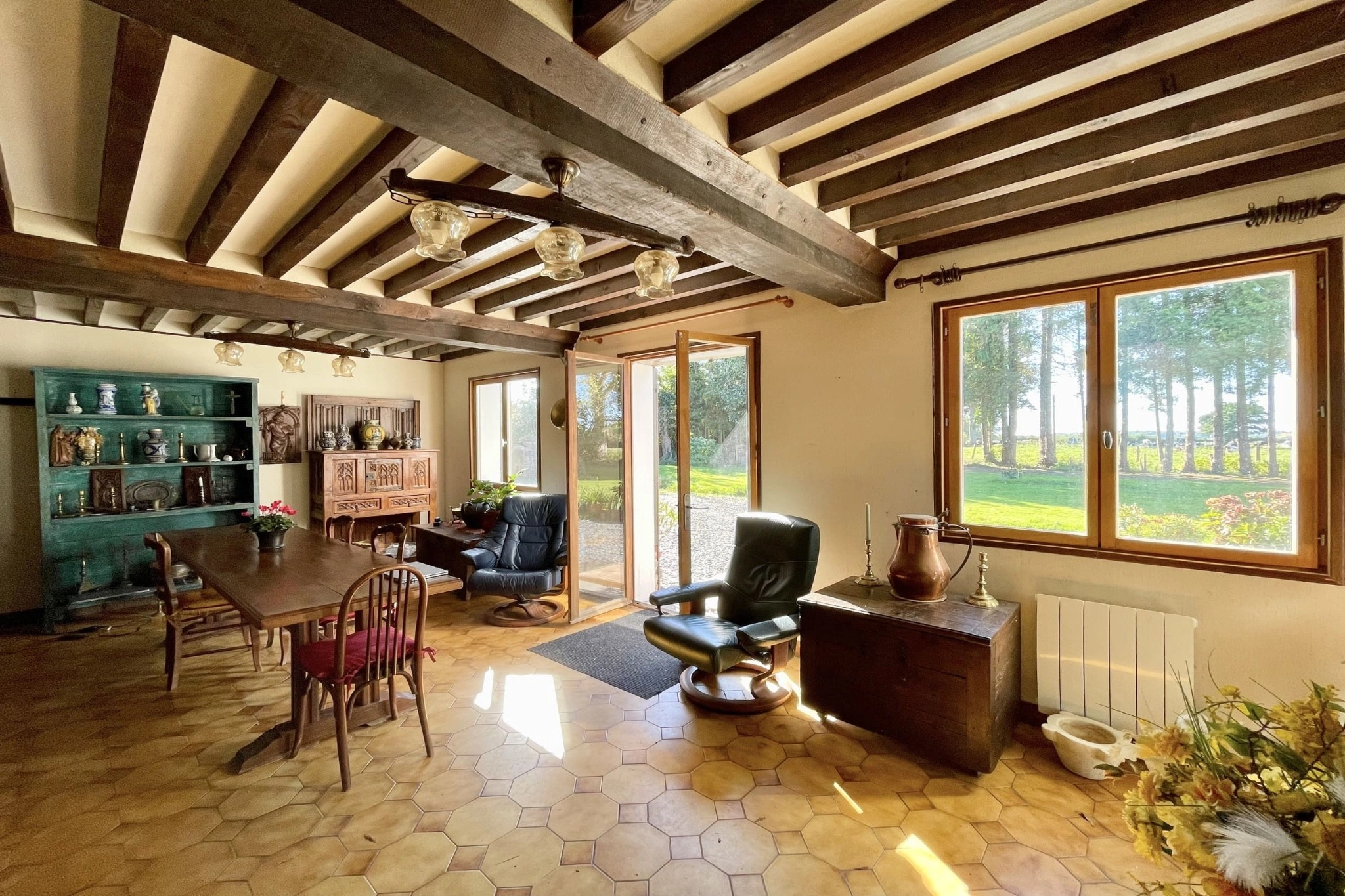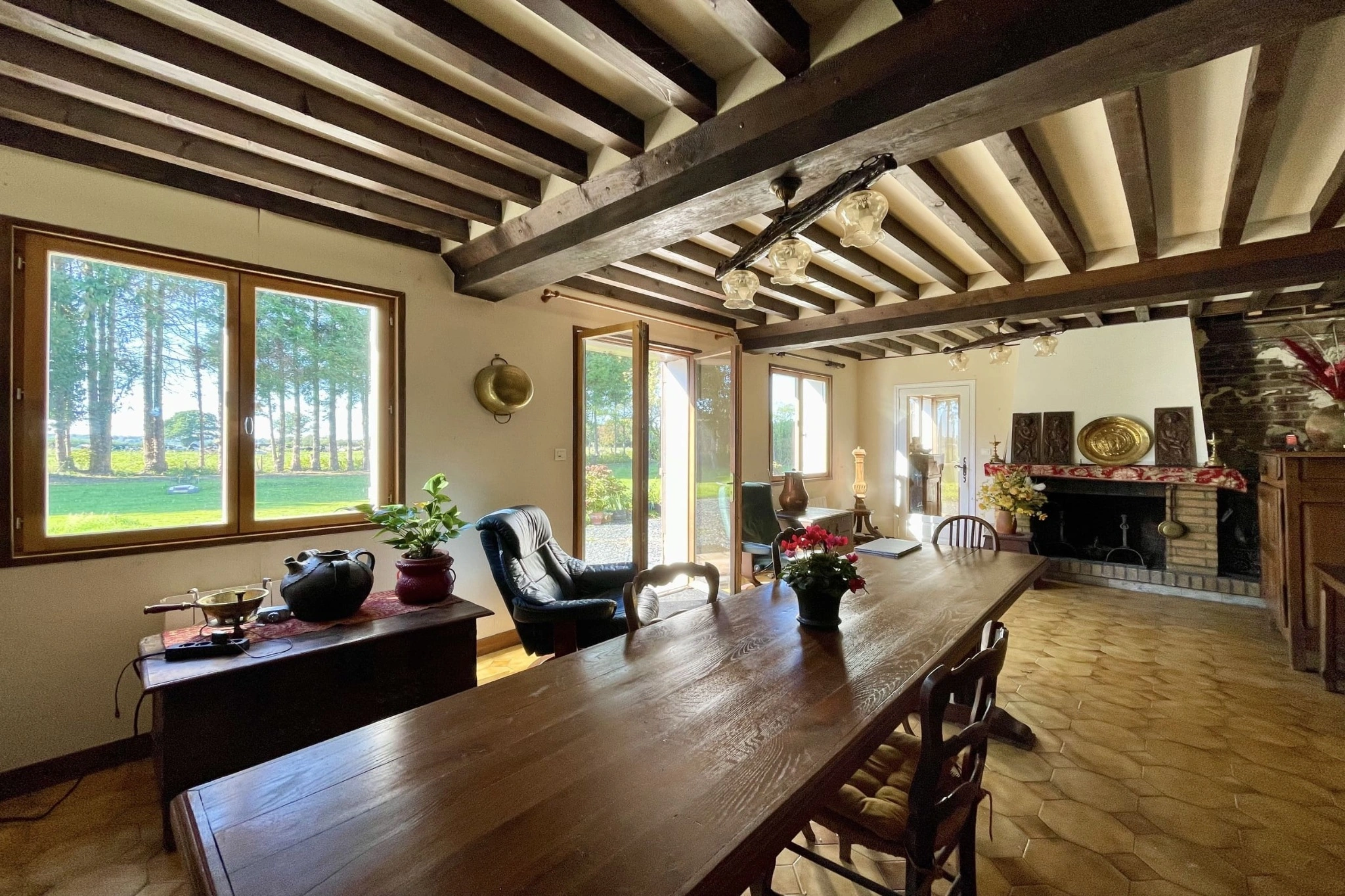 Cette demeure combine le charme de l’ancien – poutres apparentes et murs en briques – avec une distribution fonctionnelle adaptée à la vie familiale. Un garage de 30 m² vient compléter l’ensemble.