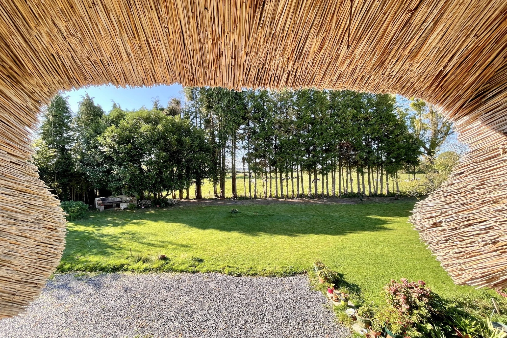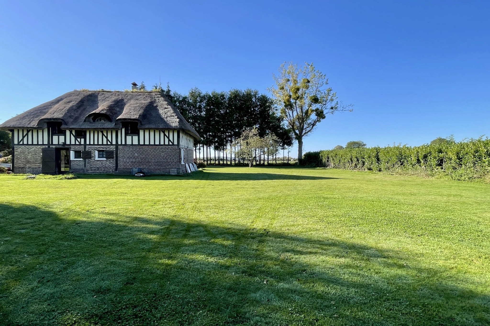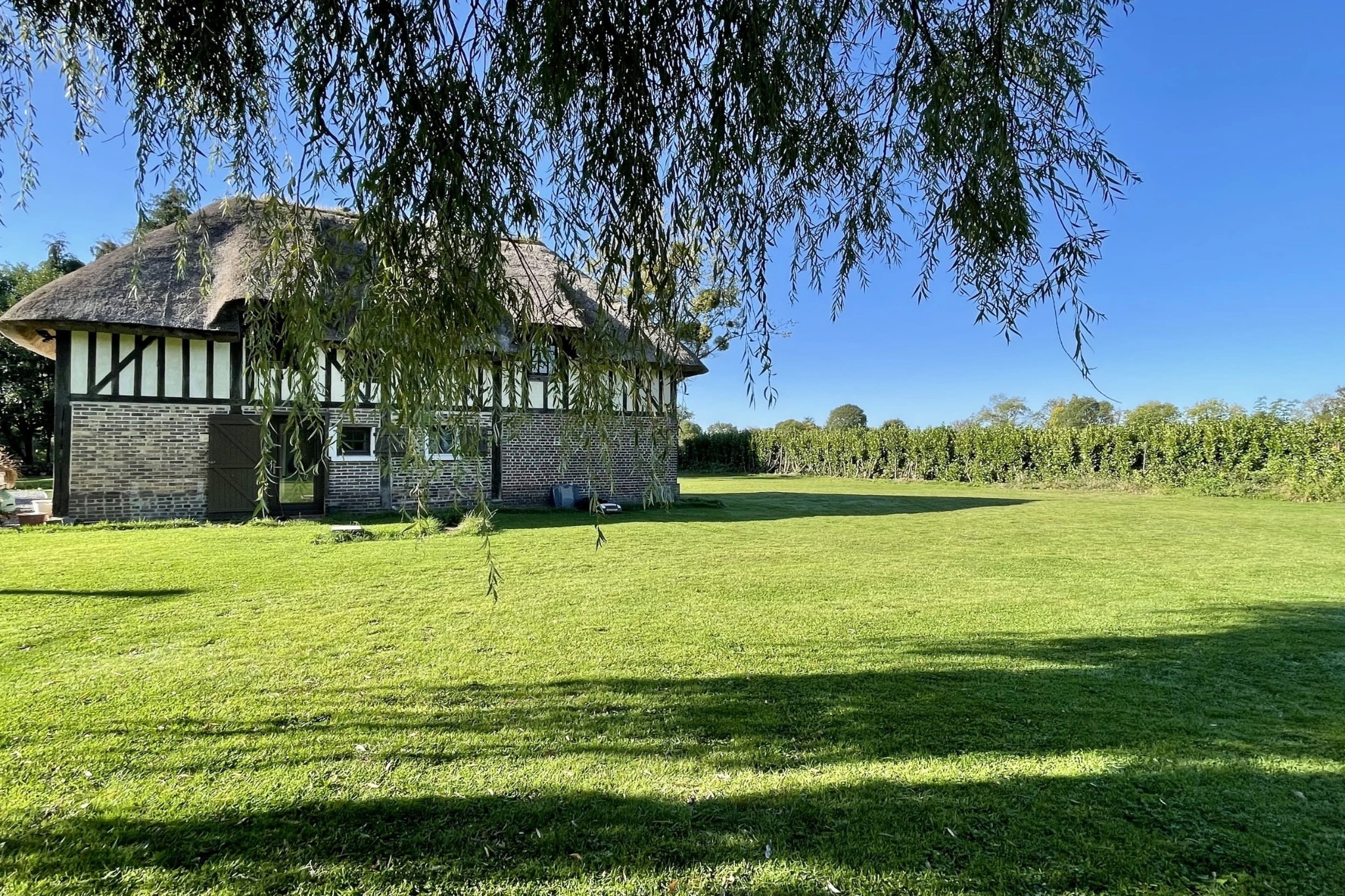 À seulement 15 minutes de Pont-l’Évêque et 30 minutes de Trouville-sur-Mer, cette authentique maison normande de 1880 séduira les amoureux de calme et de verdure. Édifiée sur un ancien pressoir et couverte d’un toit de chaume traditionnel, elle s’implante sur un terrain plat et arboré de 2 900 m², offrant un cadre naturel privilégié.