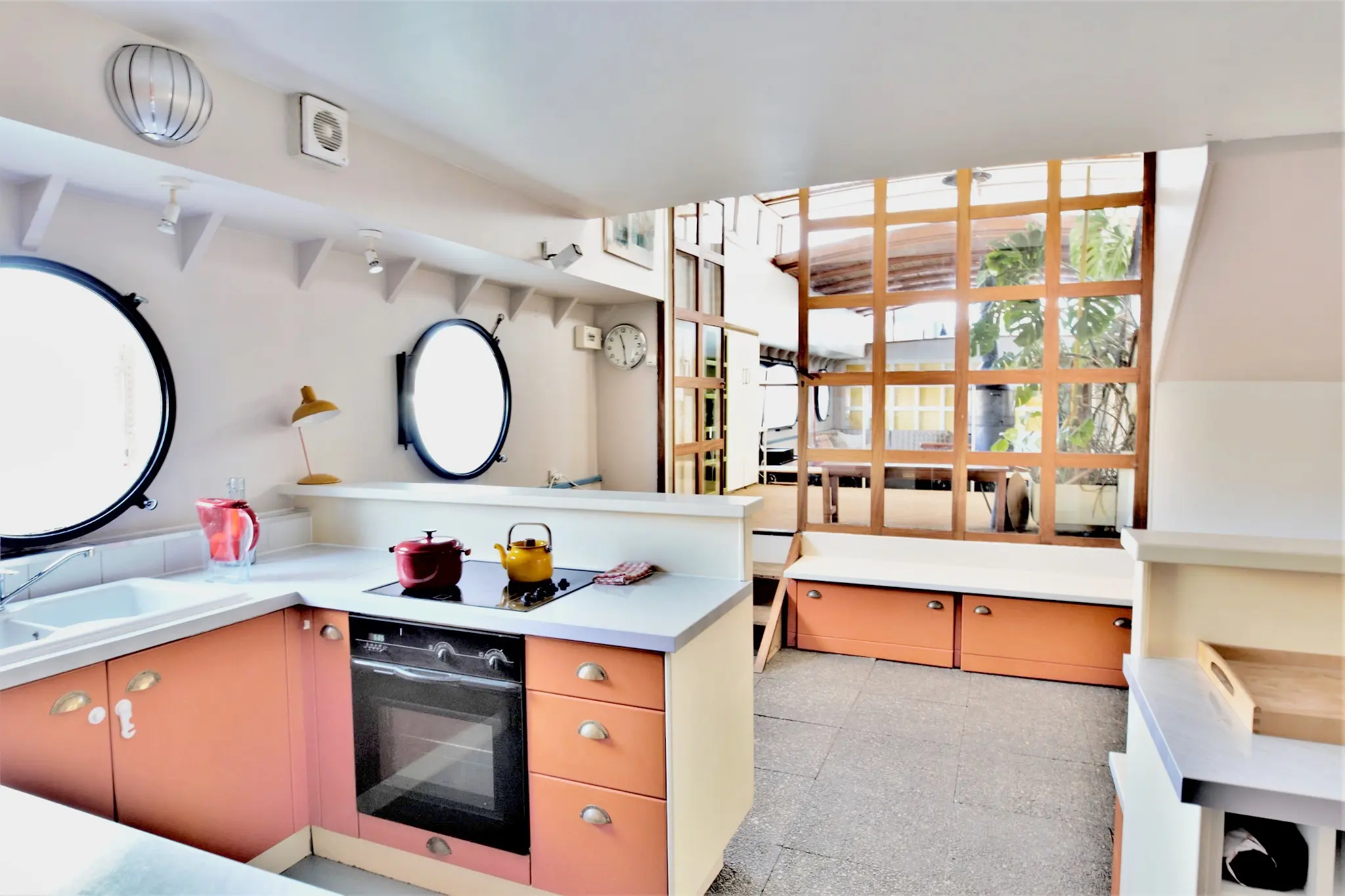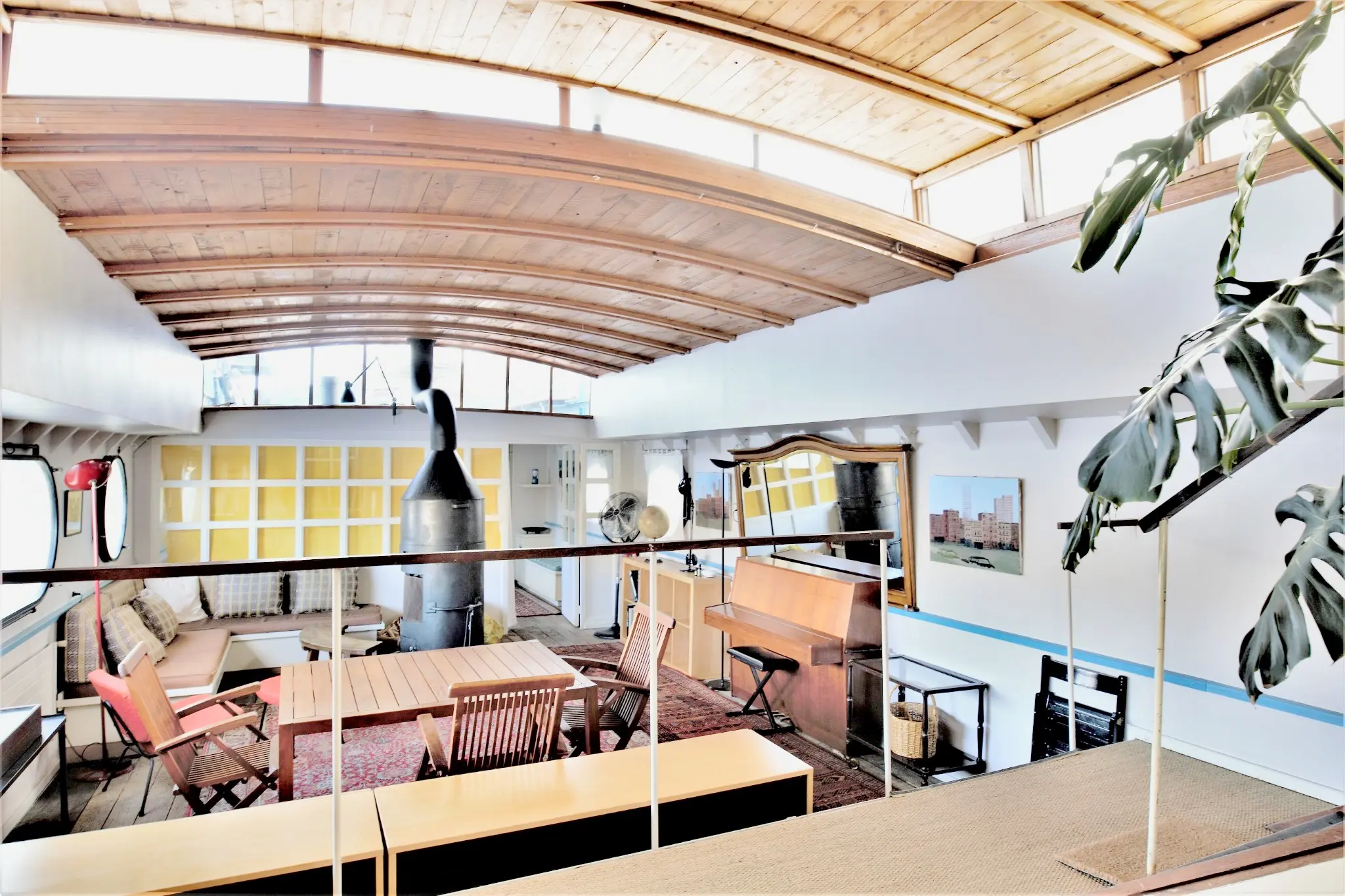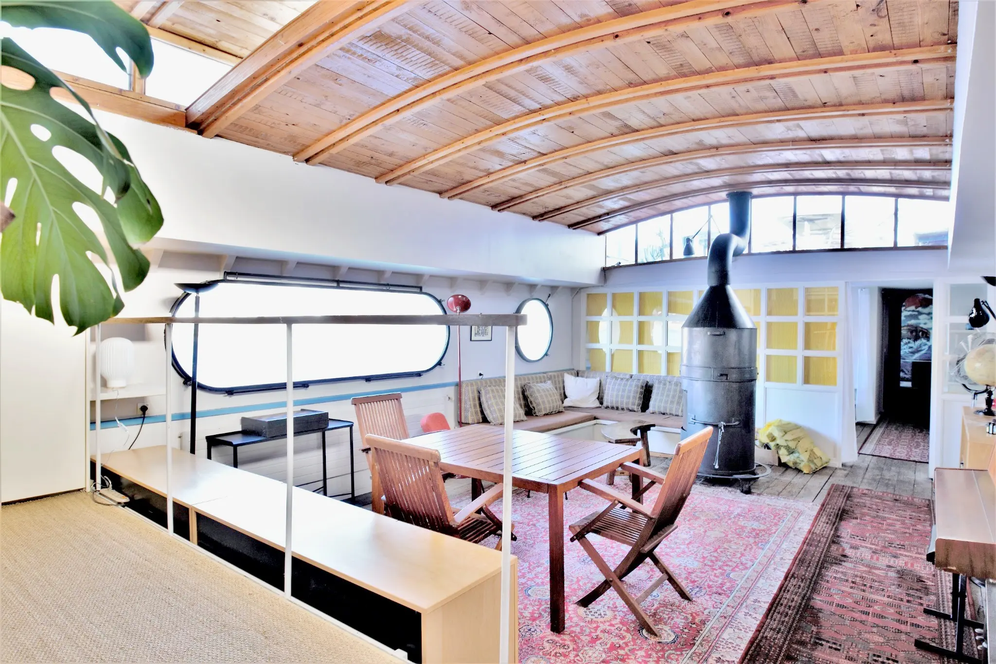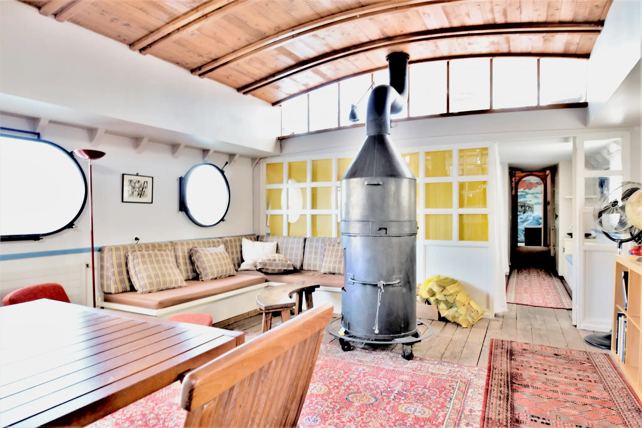 Après avoir franchi la passerelle, la découverte commence par un vaste séjour d’environ 40 m², véritable cœur de la péniche. L’espace, baigné de lumière grâce à un gigantesque hublot panoramique et un skydome, est structuré autour d’un spectaculaire poêle à bois mobile, pièce centrale qui confère au lieu une atmosphère chaleureuse et conviviale. Les lignes courbes de la coque, les plafonds voûtés et les matériaux d’origine participent à l’identité unique de cette habitation fluviale.