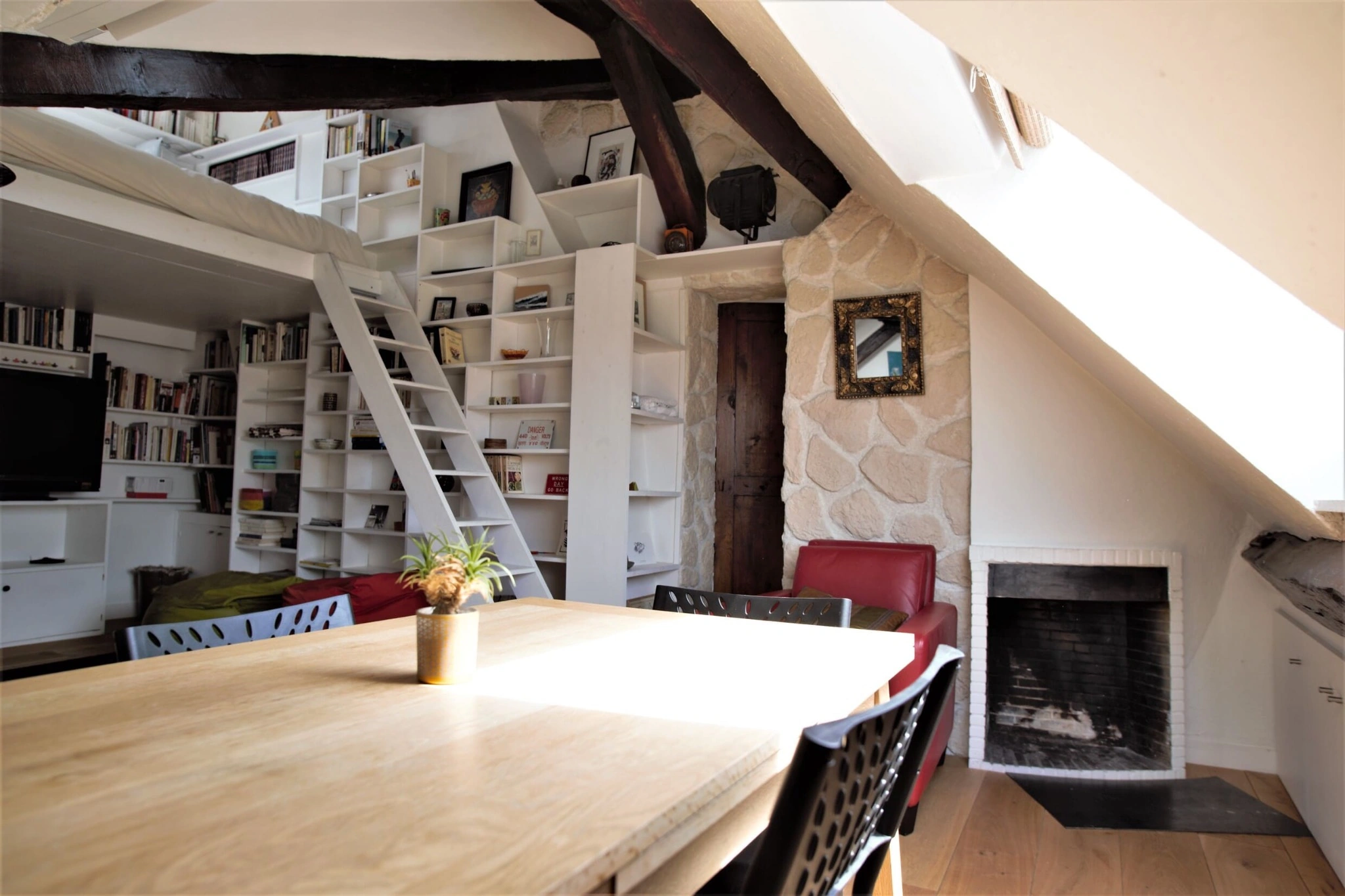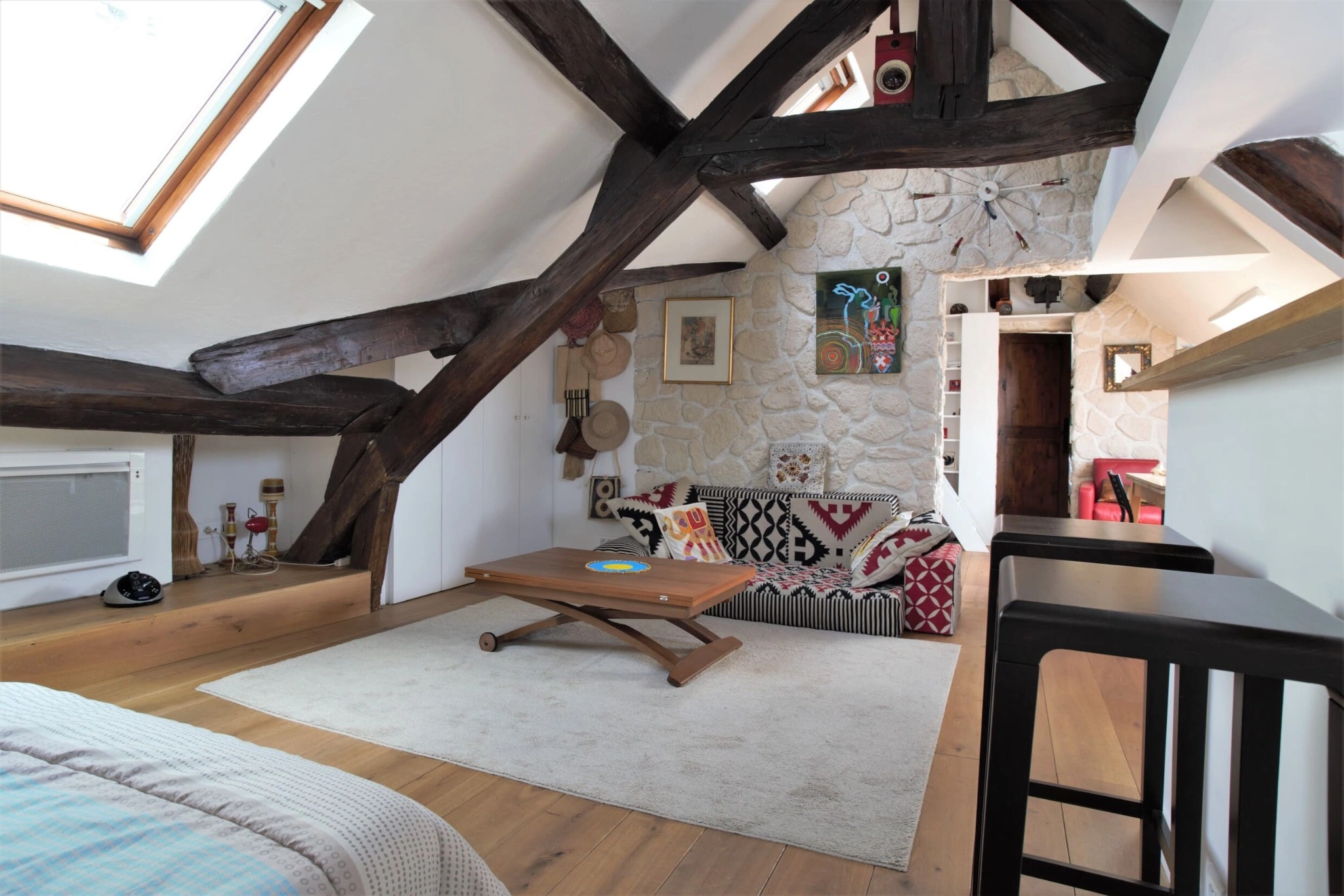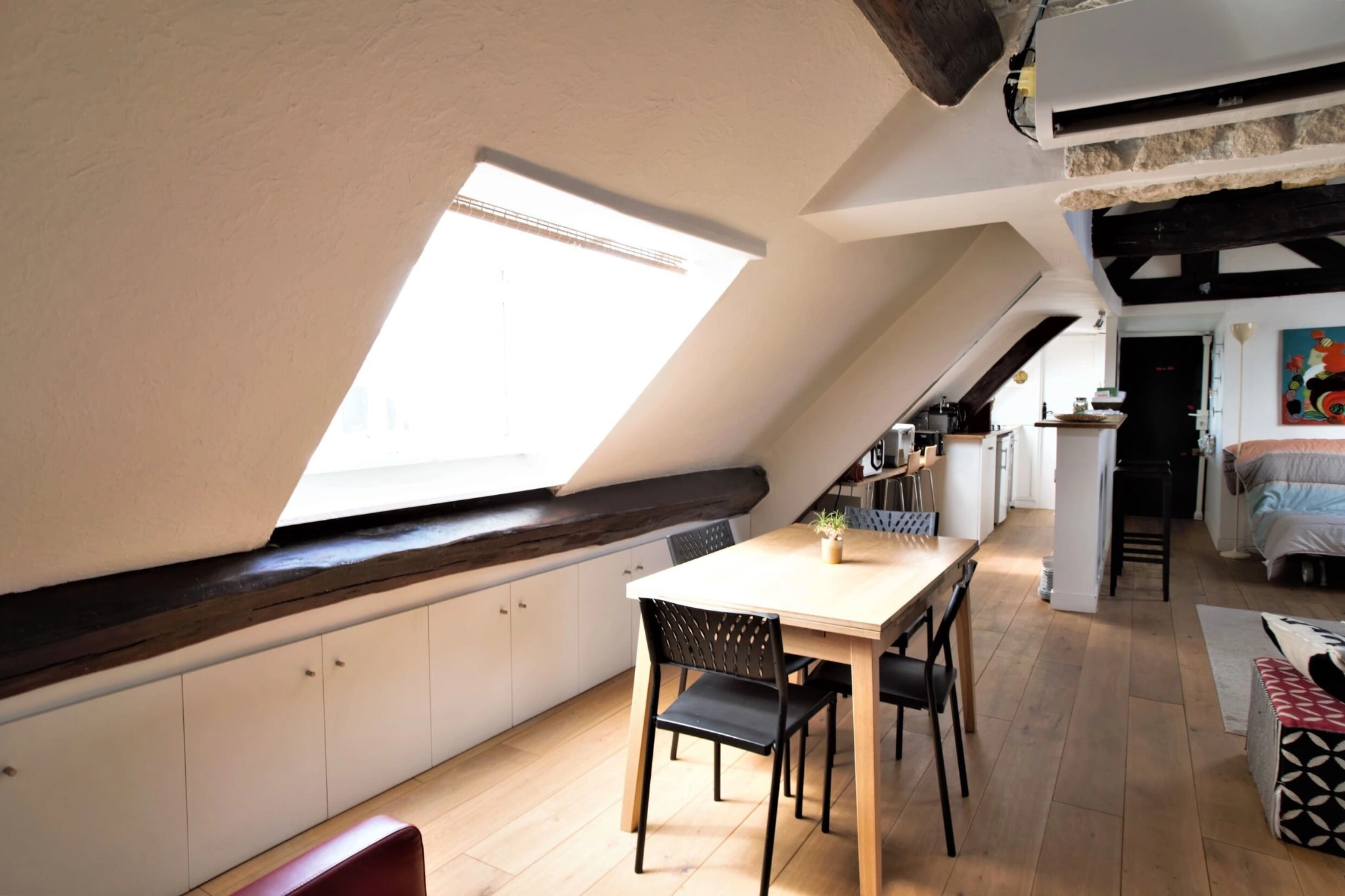 Entièrement rénové et climatisé, l’appartement conserve ses éléments de caractère avec de magnifiques poutres apparentes mises en valeur par une rénovation contemporaine. Un débarras à l’étage faisant office de cave vient parfaire ce bien rare.