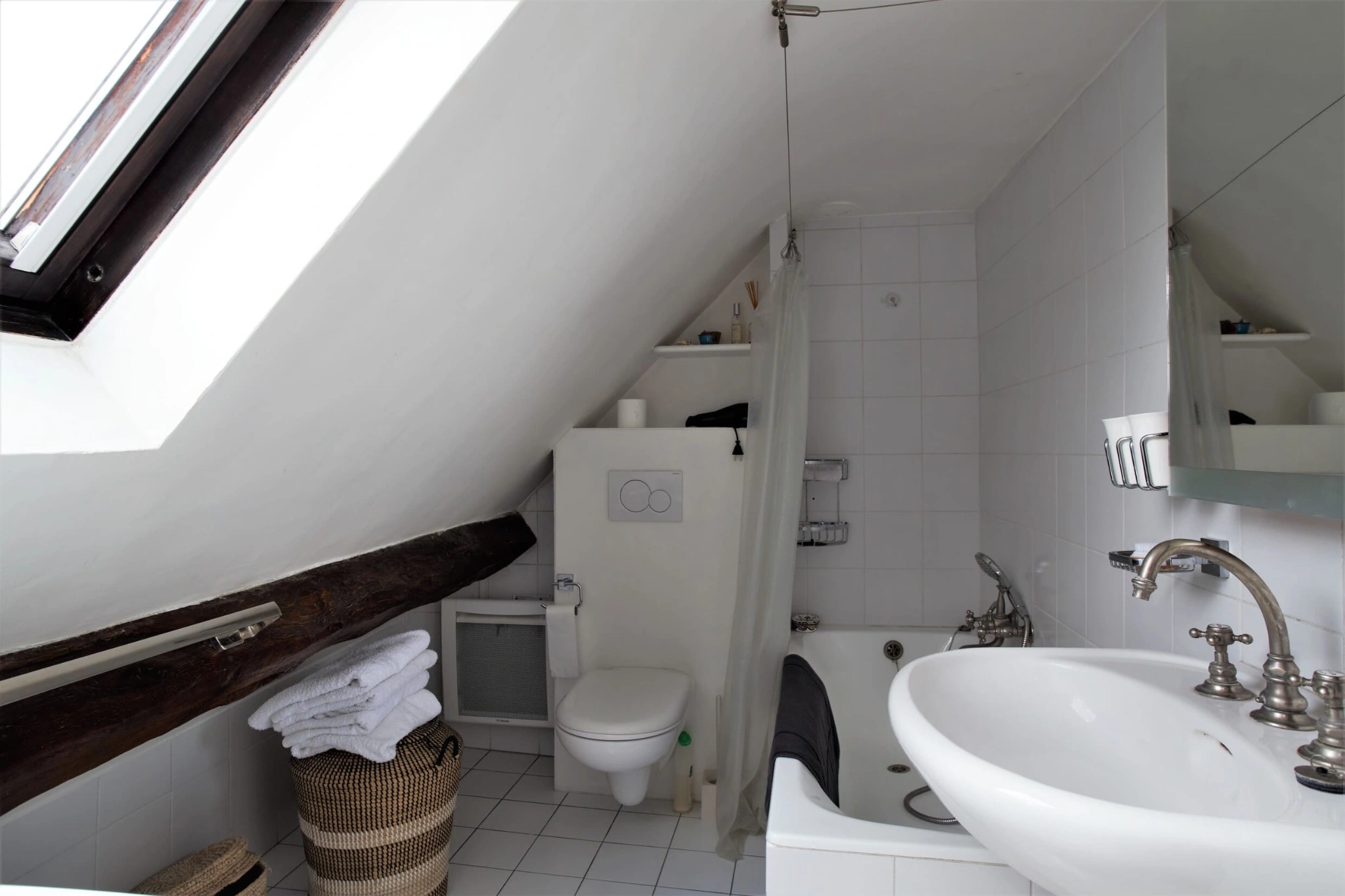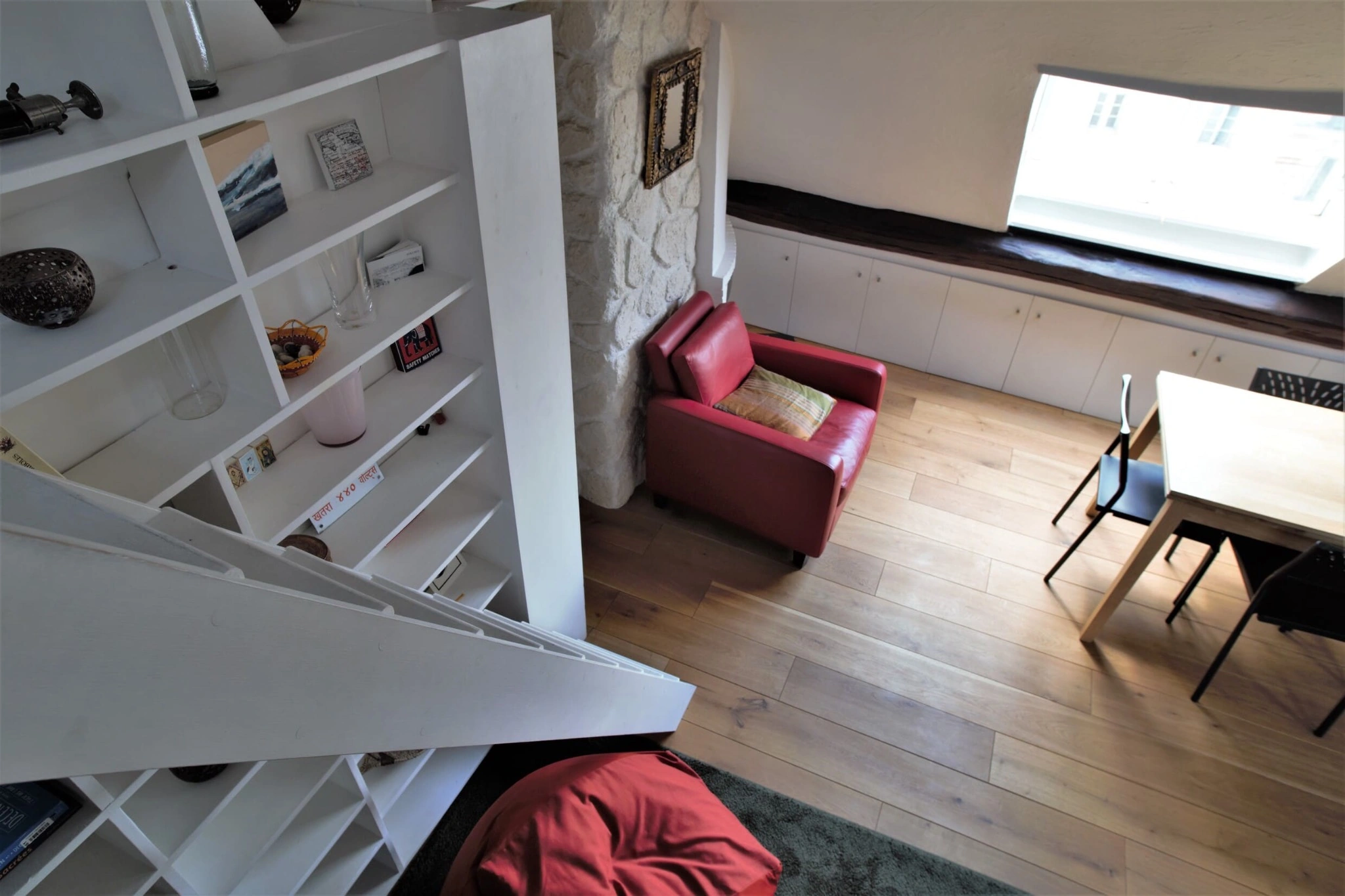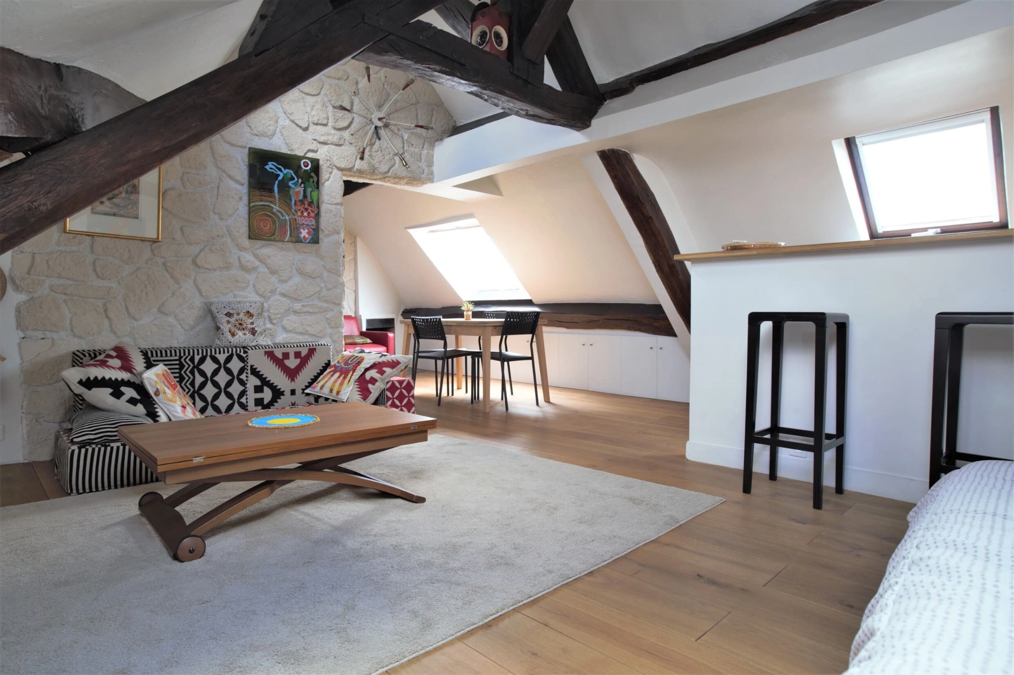 Entièrement rénové et climatisé, l’appartement conserve ses éléments de caractère avec de magnifiques poutres apparentes mises en valeur par une rénovation contemporaine. Un débarras à l’étage faisant office de cave vient parfaire ce bien rare.