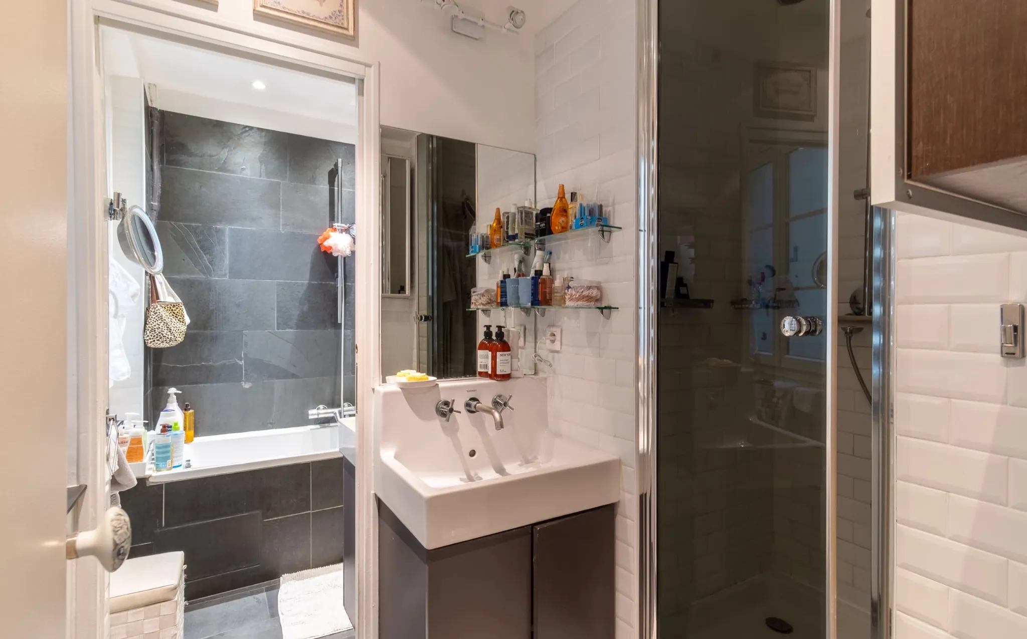 Ce duplex bénéficie d’une exposition plein sud, qui accentue la luminosité et met en valeur ses éléments anciens de caractère : parquet en bois, moulures élégantes et cheminées d’époque. Un charme intemporel qui confère à l’appartement une identité unique.