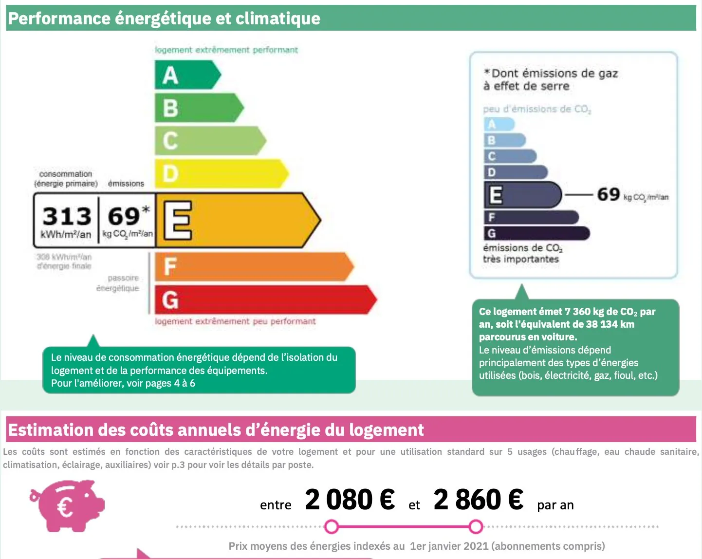 DPE. Diagnostic de performance énergétique DPE appartement à vendre Paris 18 Montmartre étiquette E consommation 313 kWh et émissions 69 kg CO2