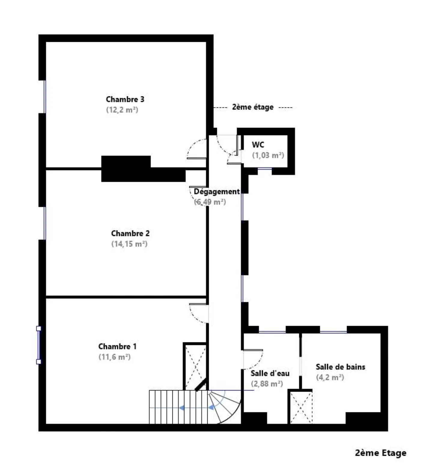 Le 2ᵉ étage abrite la partie nuit : un couloir dessert trois belles chambres avec rangements, une salle de bain fonctionnelle avec douche et baignoire, ainsi qu’un WC indépendant.