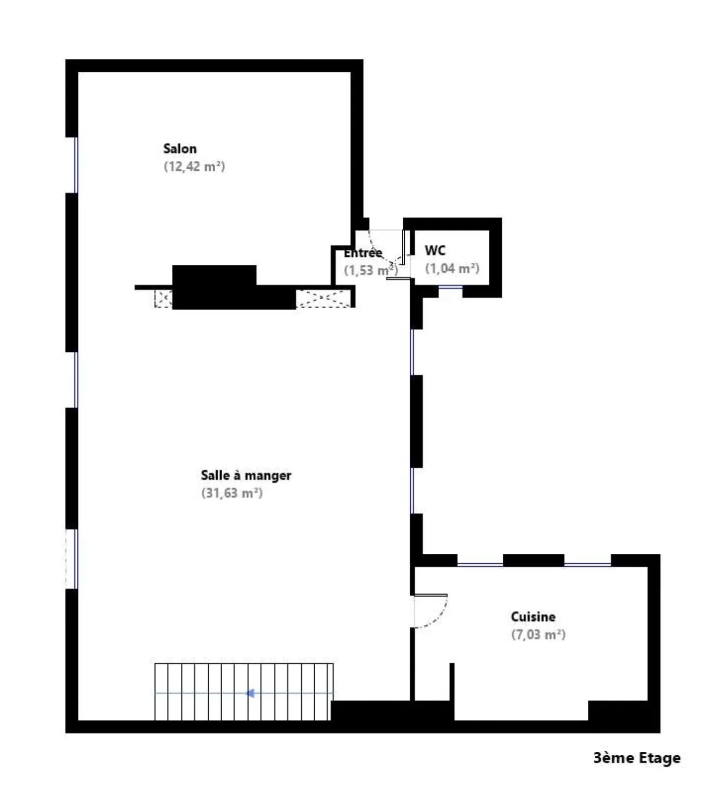 Au 3ᵉ étage, vous découvrez une entrée accueillante qui s’ouvre sur un séjour lumineux en double exposition Sud/Nord, rythmé par ses quatre fenêtres. Cet espace convivial est complété par une cuisine indépendante équipée et aménagée, ainsi qu’un boudoir pouvant servir de bureau ou de quatrième chambre selon vos besoins. Un WC indépendant vient parfaire ce niveau.
