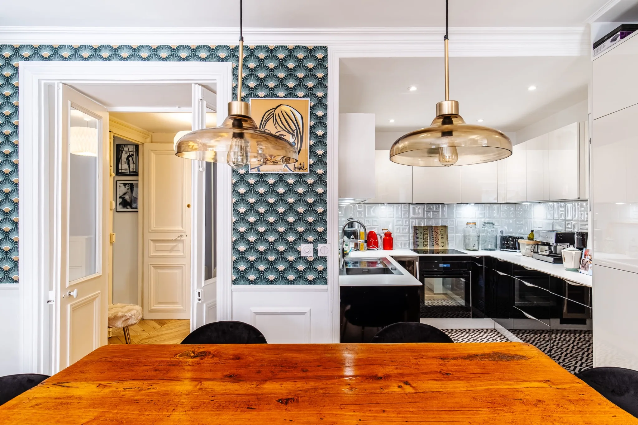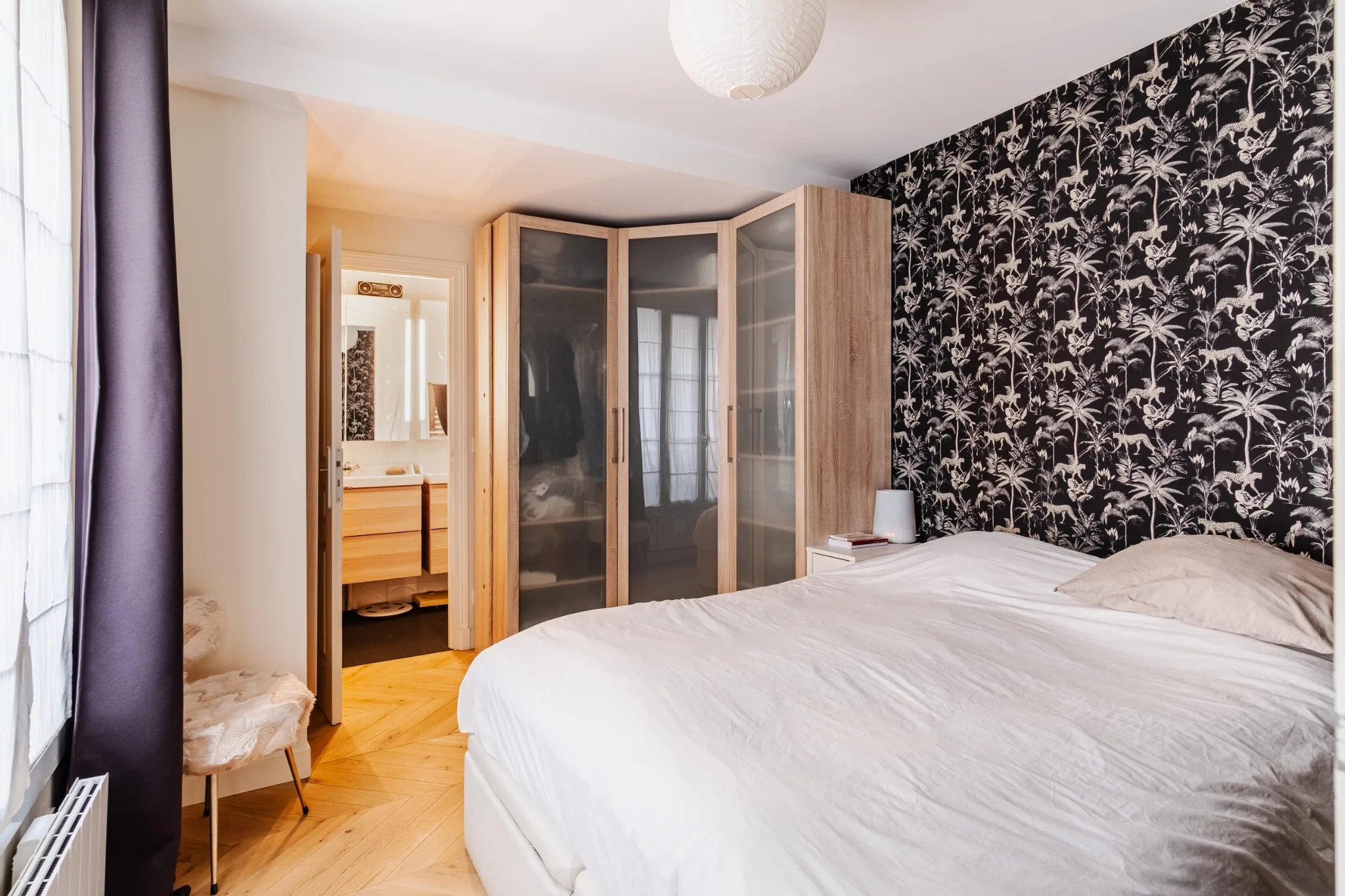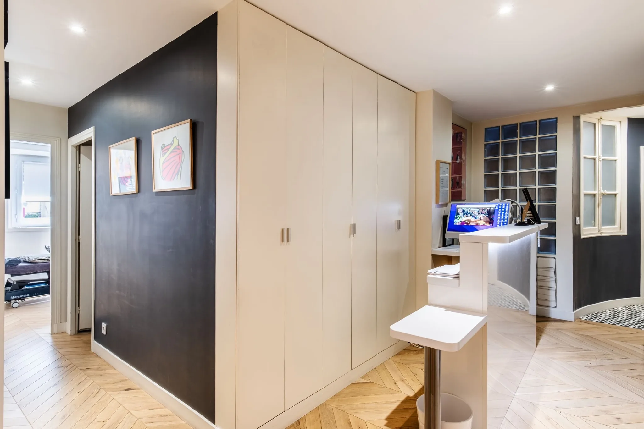 Cet appartement combine le charme de l’ancien (parquet, moulures, cheminées) et la fonctionnalité contemporaine grâce à de nombreux rangements sur mesure et des matériaux de qualité.