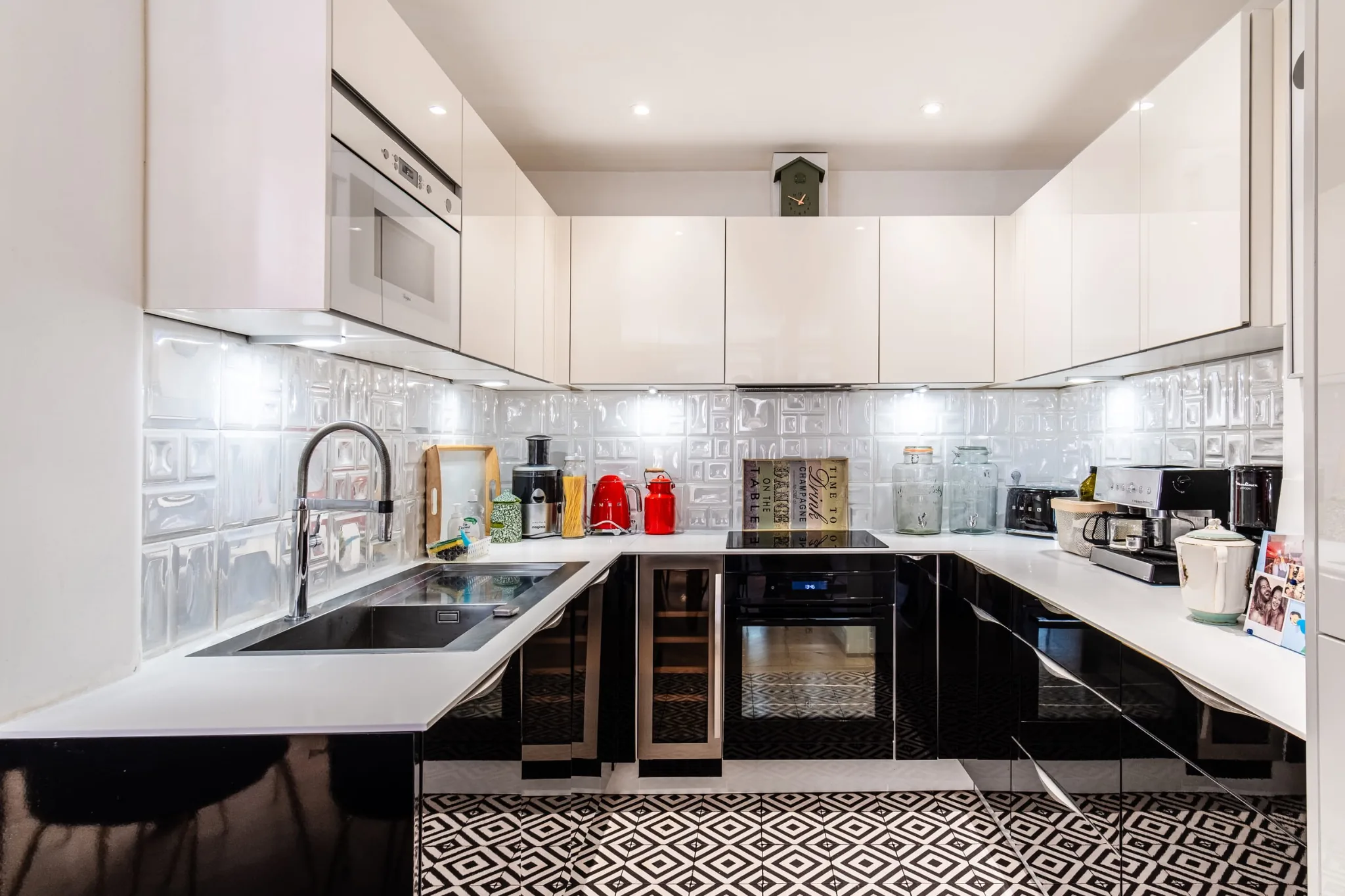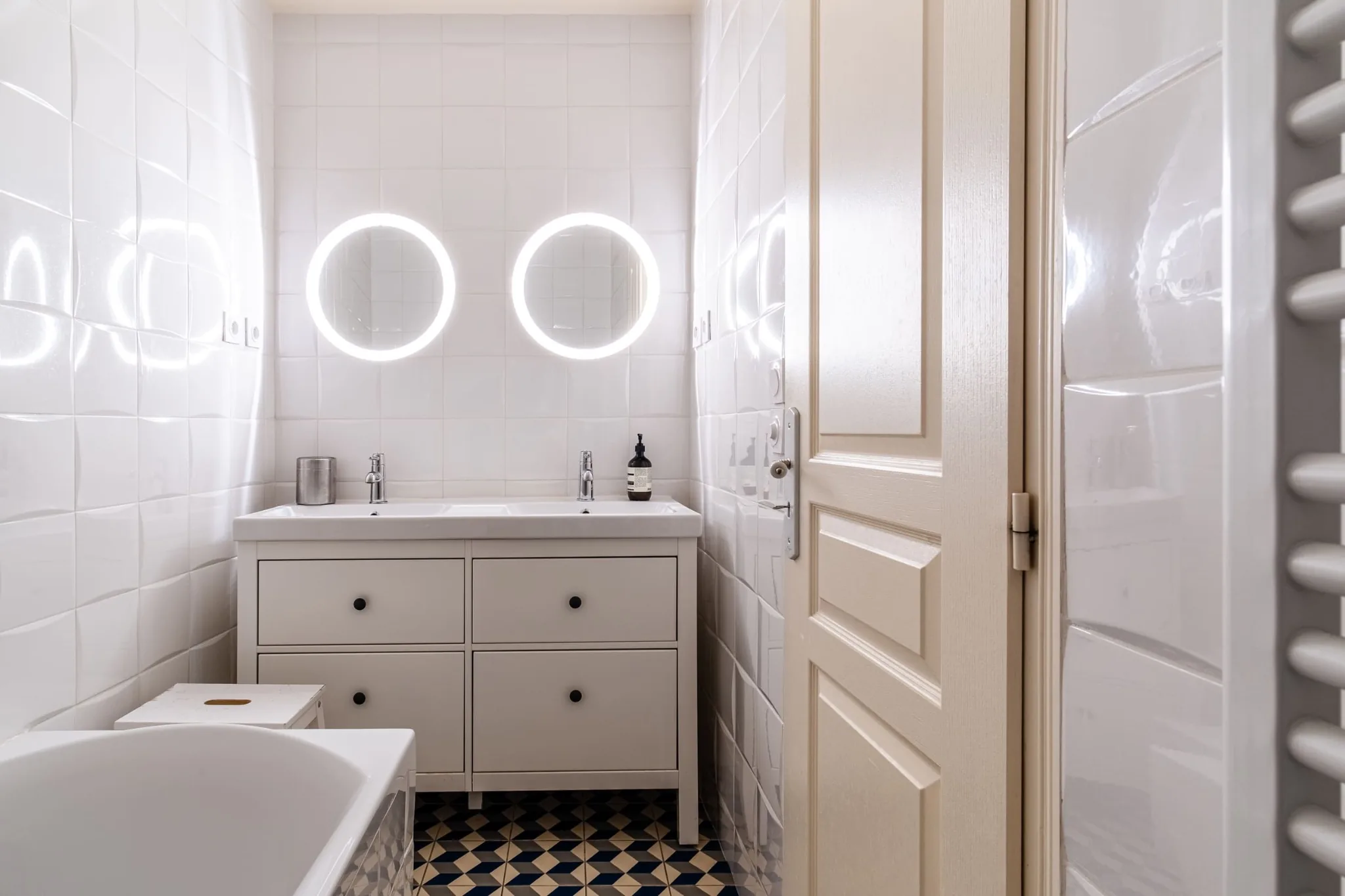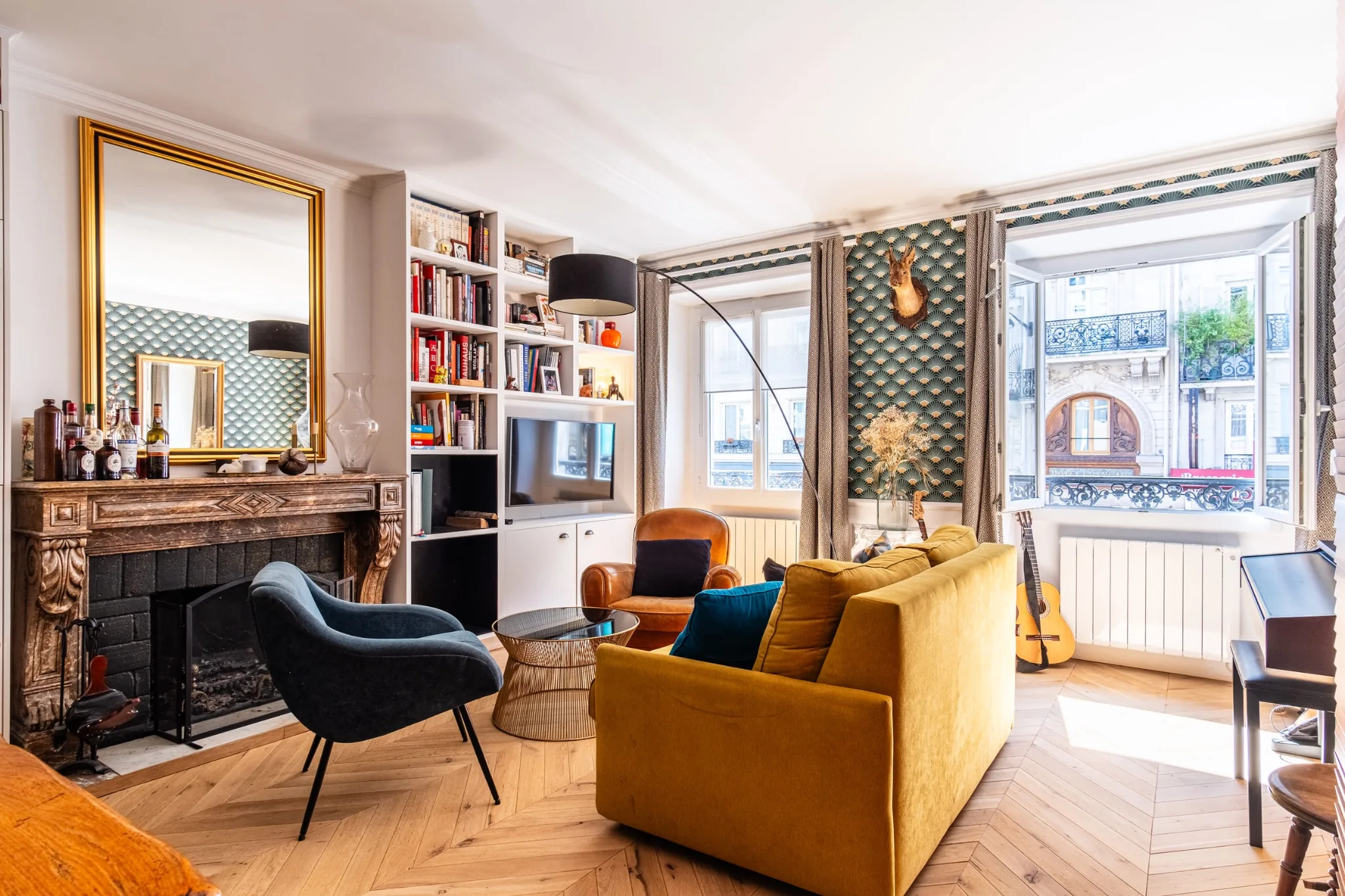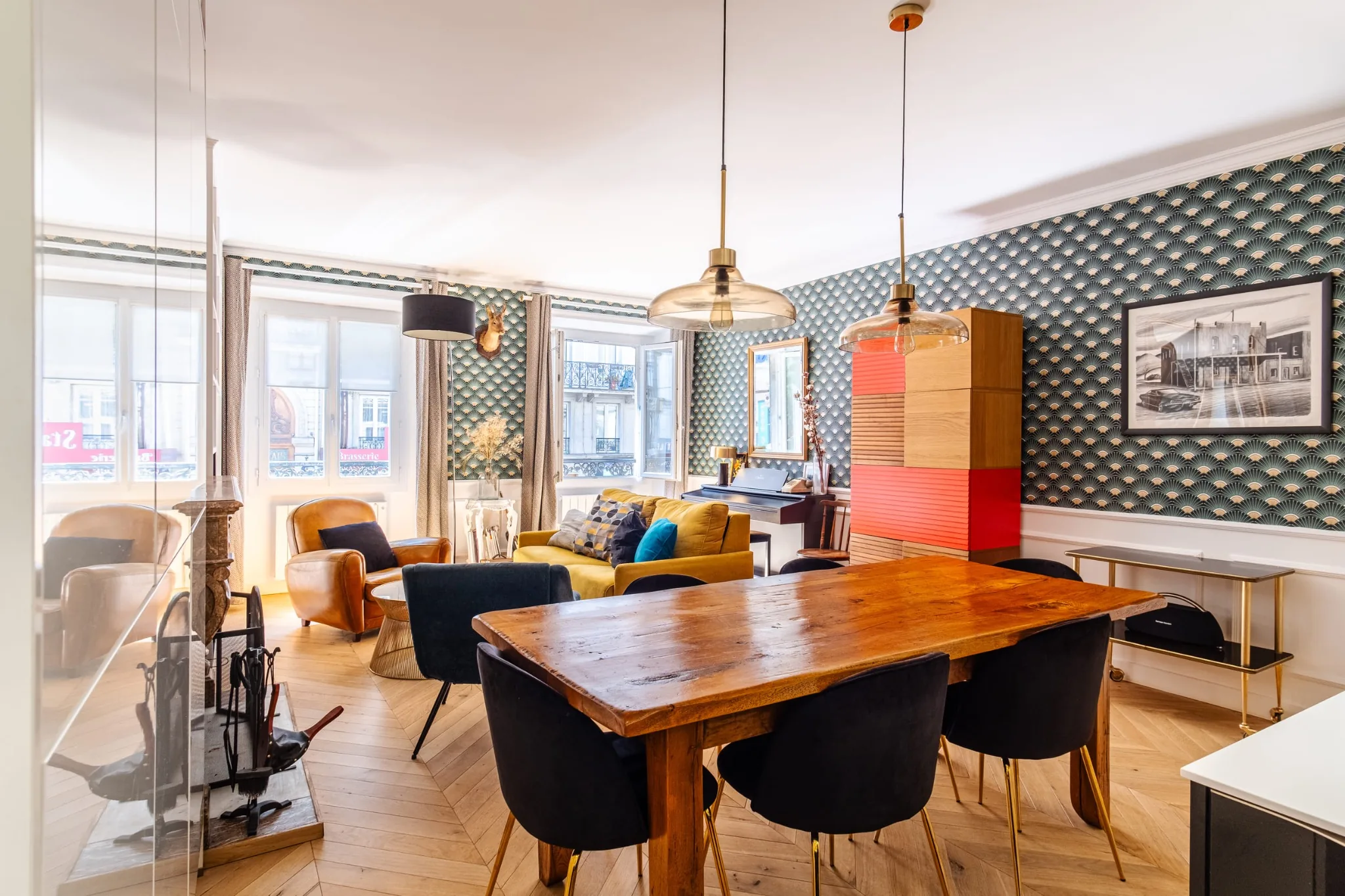 Cet appartement combine le charme de l’ancien (parquet, moulures, cheminées) et la fonctionnalité contemporaine grâce à de nombreux rangements sur mesure et des matériaux de qualité.